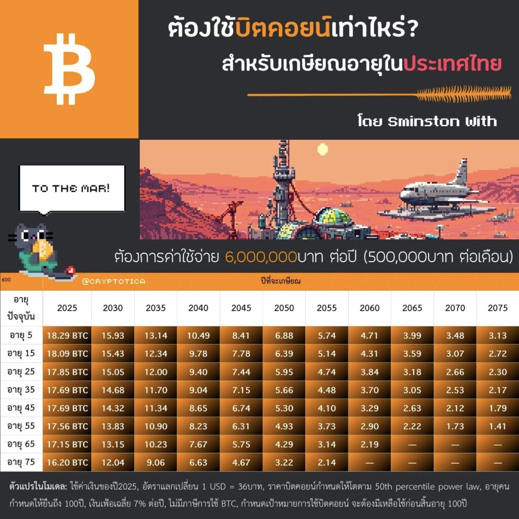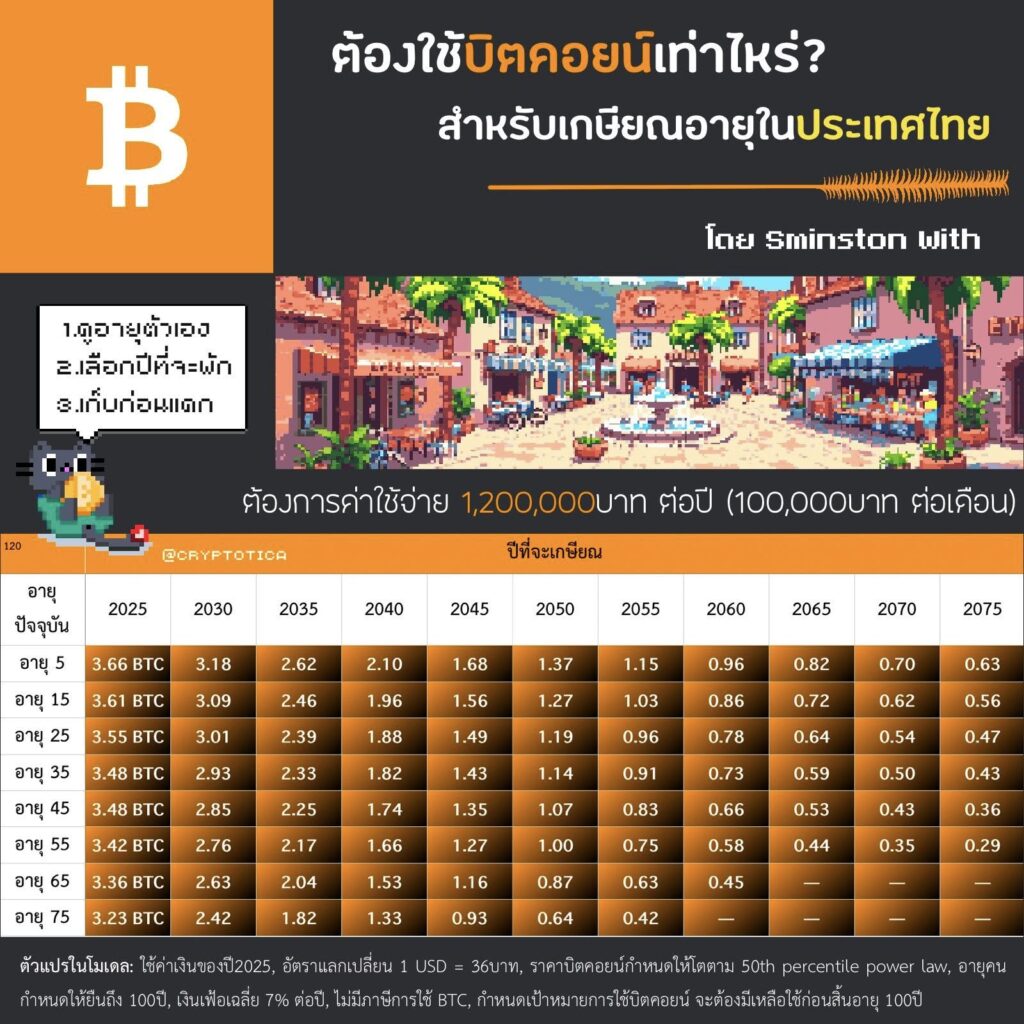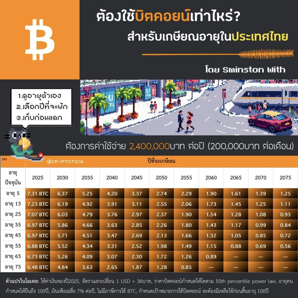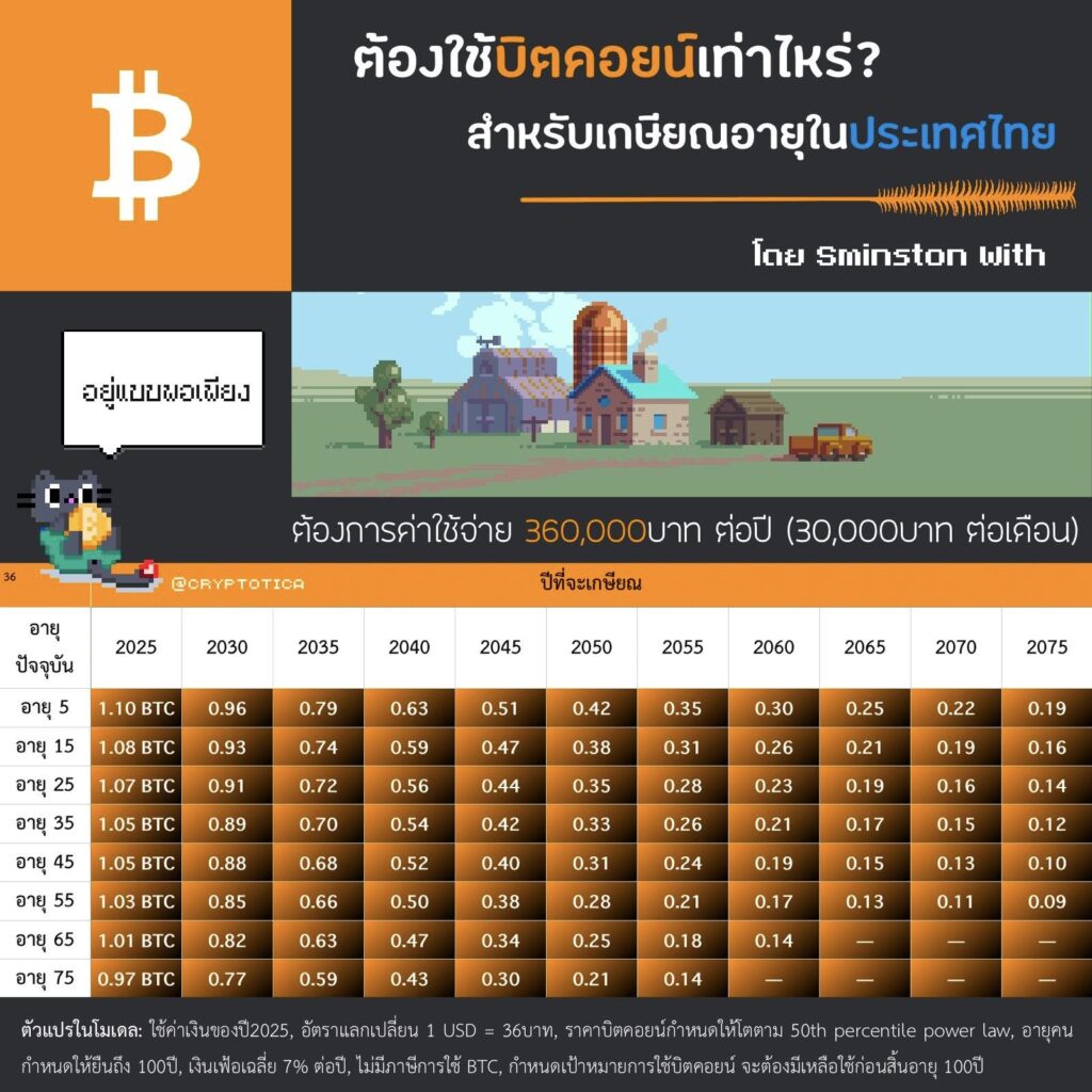 จากโมเดลนี้ เขาคำนวณจำนวน Bitcoin ที่ต้องสะสมให้ถึงก่อนถึงปีเกษียณในช่วงอายุที่ต่างกัน เช่น อายุ 25, 30, 35, 40 ไปจนถึง 60 ปี
